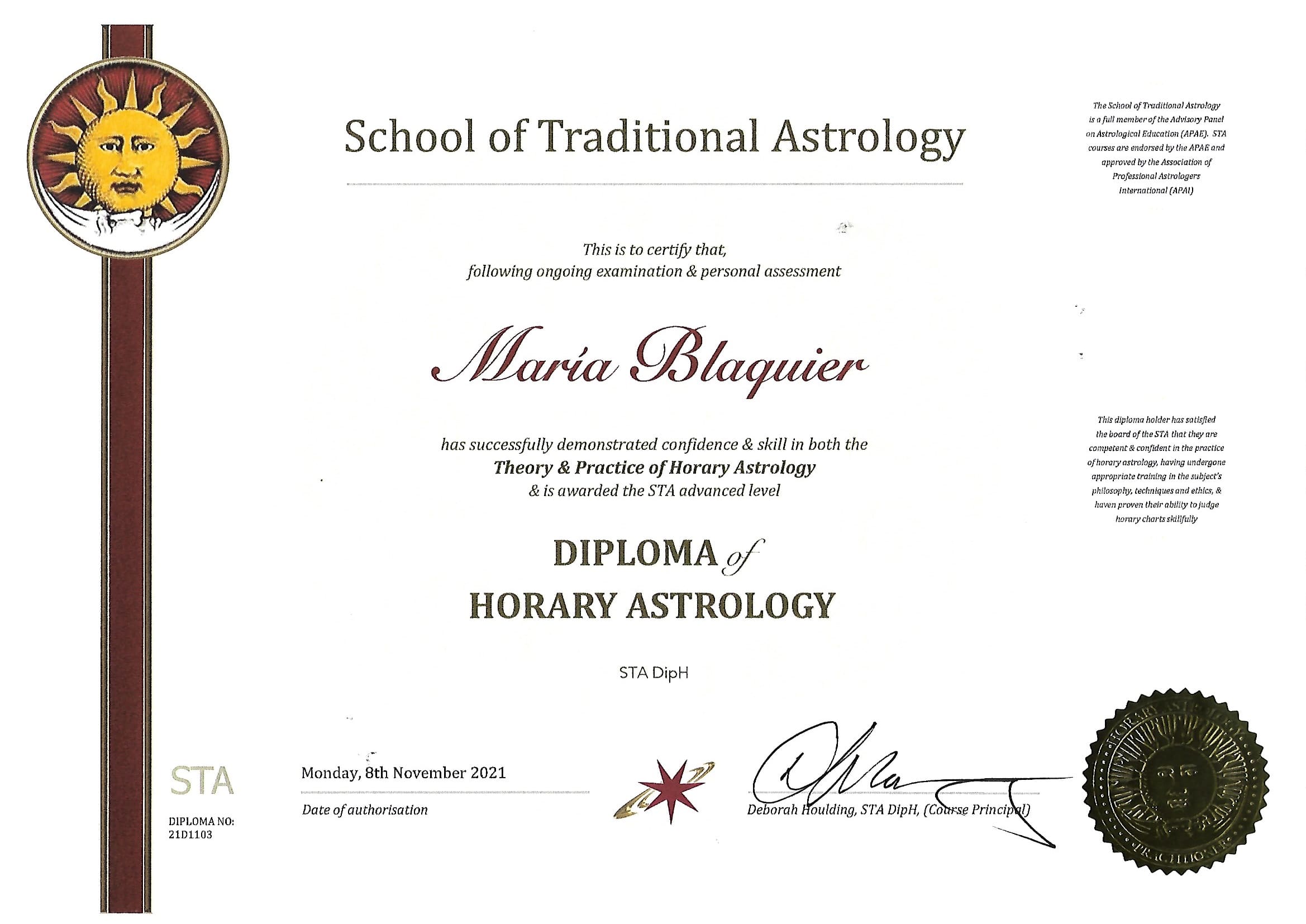Obtén tu diploma reconocido internacionalmente con nuestro Curso de Astrología Horaria, avalado por la prestigiosa School of Traditional Astrology (STA). Este certificado eleva tu perfil profesional en el mundo de la astrología.