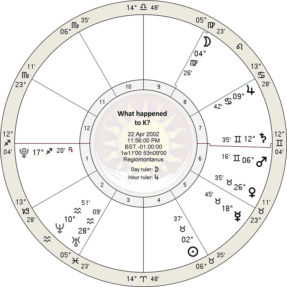 - El cálculo de cartas no se enseña como parte de este programa de estudios, a excepción de las técnicas que son específicas de la horaria (como las horas planetarias y el cálculo de orbes planetarios o puntajes de dignidad, etc.). Se espera que los participantes tengan experiencia previa en la elaboración e interpretación de cartas astrales. Consulte el gráfico a continuación para ver un ejemplo del formato aplicado a los gráficos a lo largo del curso. Los solicitantes deben poder ver, con solo mirar la carta, que la Luna se está separando de un trígono con el Sol y formando una cuadratura con Marte (que se perfecciona en 1 ° 50´), y que se coloca dentro de 1° de la cúspide de la casa 9. También debe entenderse que Venus es cadente pero en su propio signo de dignidad, y que si Venus estuviera colocado en Aries sería en su signo de detrimento. (Se recomienda que cualquier persona que no pueda seguir con confianza ese nivel de narrativa astrológica adquiera más experiencia antes de emprender este estudio de astrología horaria).